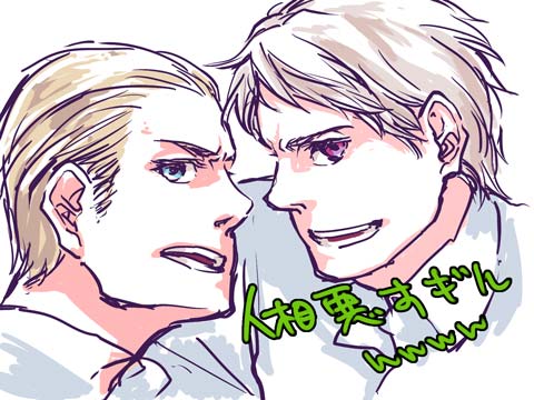 日本語の発音の容易さを恨みます…何で話す時にあんなに口動かす気になるのorzドイツ人の先生が英語を話すときのwの発音が好きなんです。vの音になりかけてるのに悶える…!EU論で面白い話聞いたりトルコ語が楽しかったり充実しています。楽しいなー。ワルキューレも見にいけたし!それにしても独のキャラソン^^^ピッチ上げの兄さんverと堪能させていただいてます^^^^主に腹筋が死にそうキャラソン記念に!本能のままに描くと眉間に皺がどんどん…